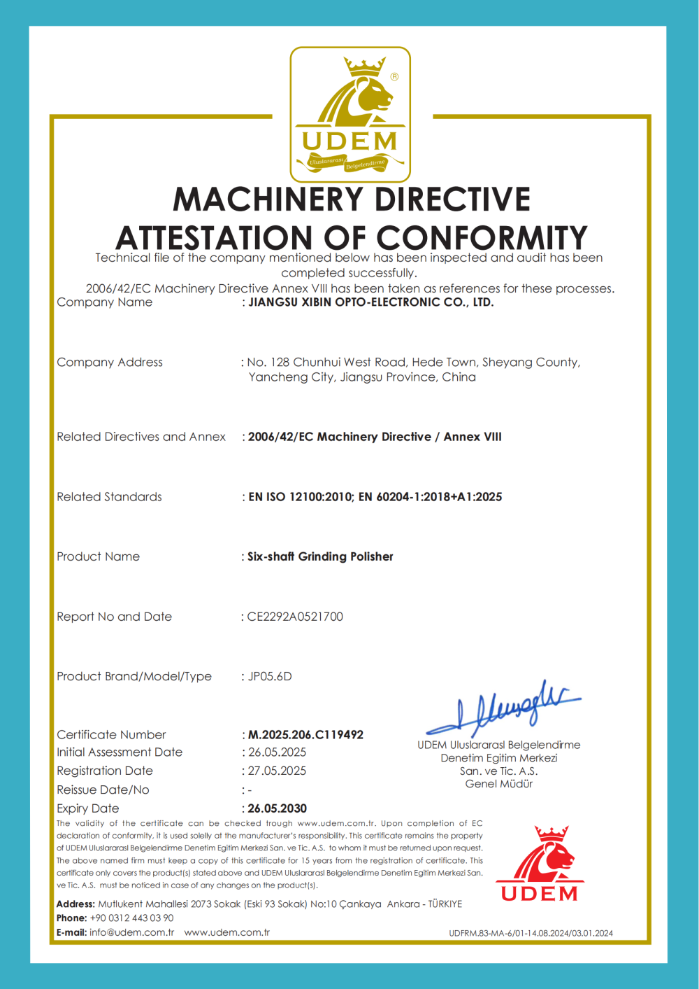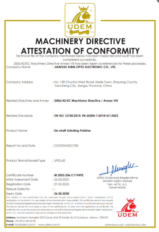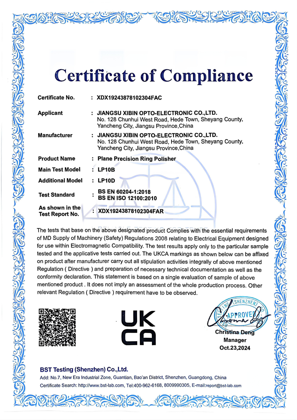 Xibin Optoelectronics (Jiangsu) Co., Ltd. расположена в Шэянге, городе Янчэнге, провинции Цзянсу, в родном месте прекрасных красноголовых журавлей. Площадь завода составляет 40 мю, площадь производственного и обработочного цеха — 20 тыс. кв. метров, а площадь оптического обработочного лаборатории класса 10 000 — 2500 кв. метров. Его штаб-квартира, Wuxi Xibin Optoelectronic Equipment Co., Ltd., находится в Вуси, на прекрасном берегу озера Тайху. В 2023 году в Сяане был создан центр исследований и разработок по роботному полированию.